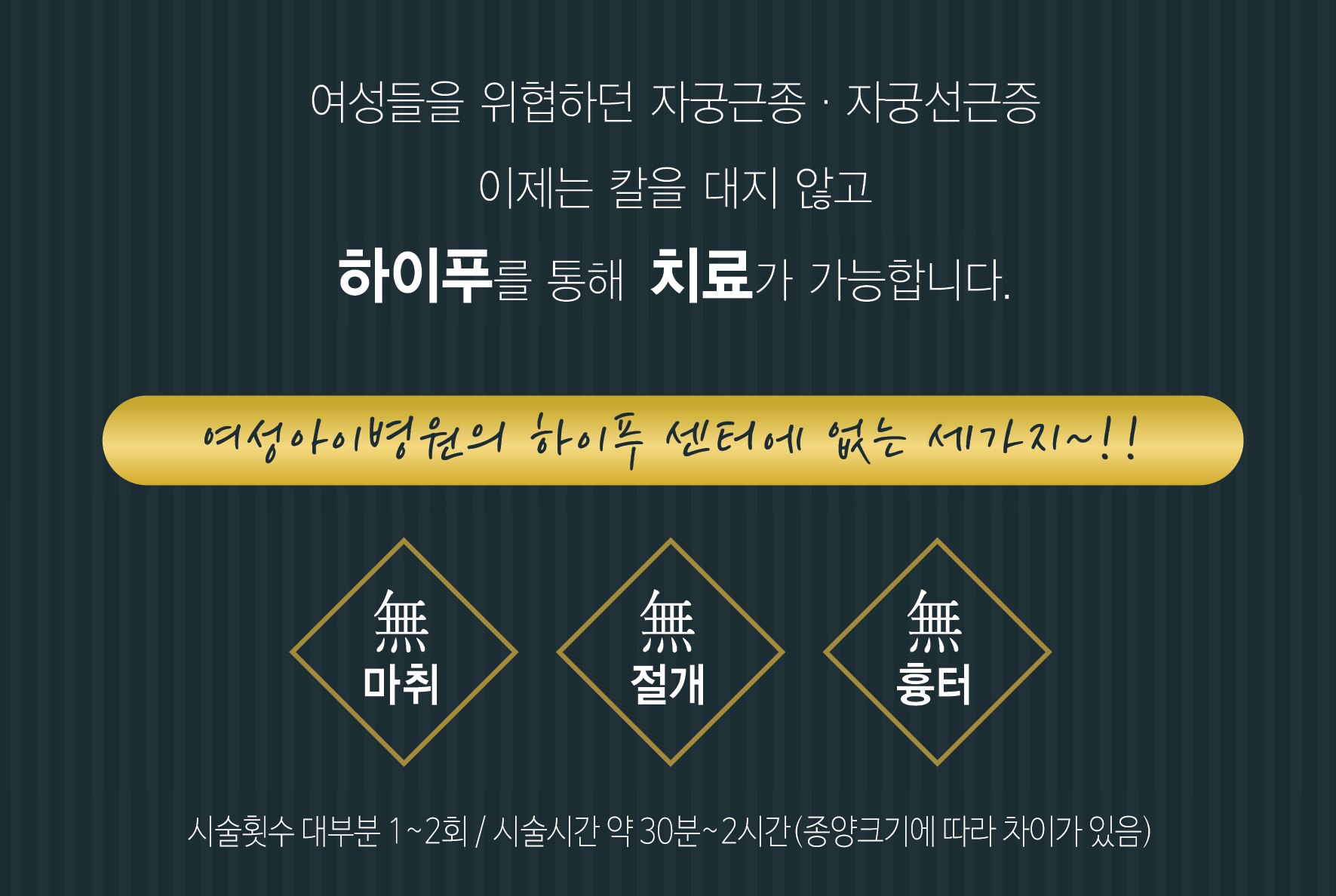 절개, 마취, 출혈, 흉터 등이 없음, 자궁을 보존하면서 자궁근종/선근종만 제거간소한 치료과정